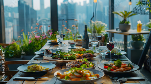 A grand dining table with a feast of international dishes in a bustling city rooftop restaurant.