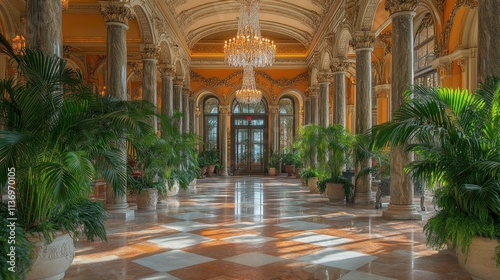 architecture, interior, design, elegance, luxury, chandelier, column, marble, flooring, plant, light, space, decor, ornate, beauty, symmetry, warmth, style, classic, ambience, heritage, culture, grandeur, refinement, hospitality, attraction, opulence, relaxation, comfort, inviting, historical, artistry, craftsmanship, detail, setting, calmness, lush, vibrant, aesthetic, welcoming, charme, sophistication, visual, life events, allure