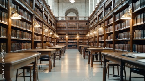 A grand library interior featuring rows of bookshelves, wooden tables, and warm lighting, creating a serene atmosphere for reading and study.