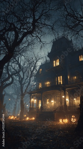 A grand mansion light up from indoor surrounded by twisted bare trees