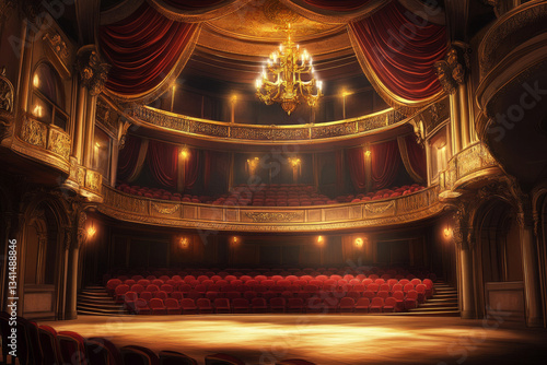 grand, opera, hall, three-dimensional, background, room, deep, red, velvet, seat, arranged, elegant, semicircle, majestic, gold, chandelier, hanging, painted, ceiling, massive, stage, draped, luxurious, curtain, warm, spotlight, beam, highlighting, ornate, wooden, balcony