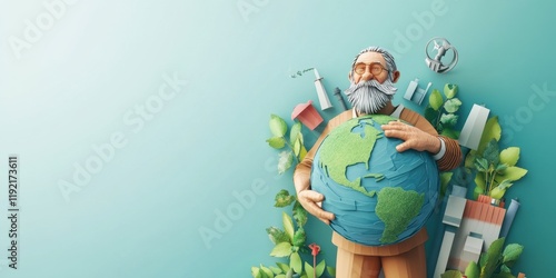 A Grandfather Figure Embracing Our Planet Earth: A 3D Paper Art Depiction of Environmental Conservation and Sustainable Living