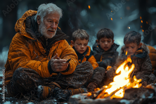 A grandfather telling stories around a campfire, with his grandchildren gathered around listening intently. Concept of storytelling and bonding.