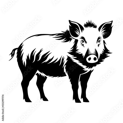boar, hog, animal, mammal, wildlife, nature, black-and-white, illustration, graphic, design, artwork, icon, symbol, outline, silhouette, creature, fauna, tusk, strength, forest, outdoors, powerful, strong, aggressive, wild, art, drawing, isolated, monochrome, vector, image, front view, standing, fur, snout, bristle, thick, detailed, realistic, character, simple, elegant, stylised, vintage, retro, engraving, vignetting, shape