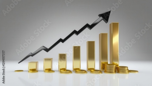 A graphic representation of rising financial growth, featuring gold bars and coins against a gray background with an upward arrow illustrating progress.