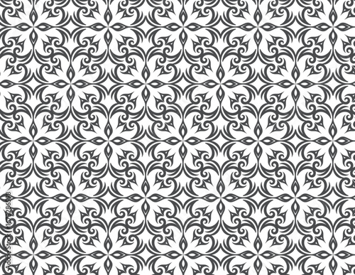 A gray and white ornamental pattern with symmetrical floral and arabesque motifs.