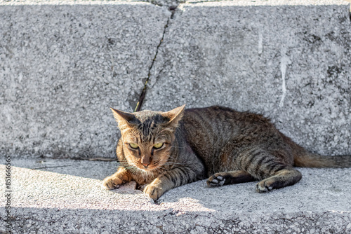 A gray angry serious cat on a stone bench in the park basks in the sun, close-up. Homeless animals