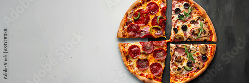 A gray background showcases a top down view of an Italian pizza split in half creating a flat lay banner that offers copy space for text
