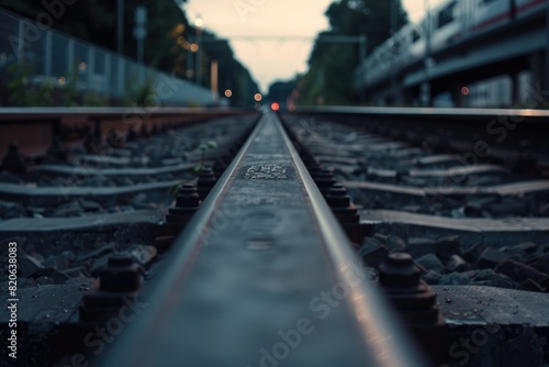 A gray metal train rail at daytime, evoking an industrial atmosphere.