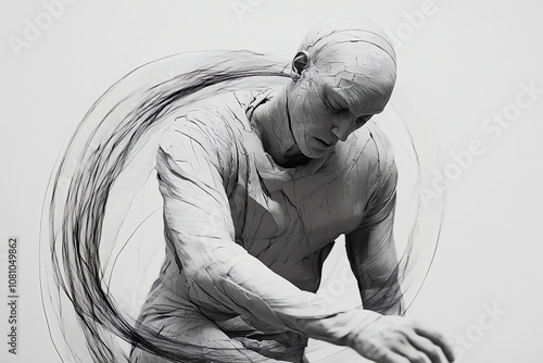 A grayscale 3D render of a human figure with a swirling motion blur effect around it.