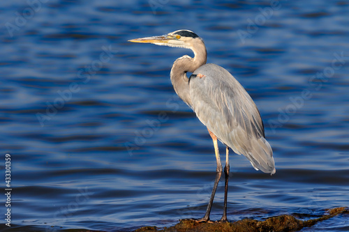 A Great Blue Heron (Ardea herodias) standing on a lake shore