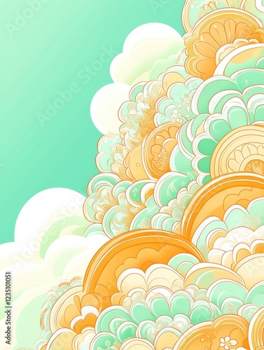vibrant, green, yellow, background, multitude, circle, flower, orange, lively, sky, creating, atmosphere, energetic, cheerful, playful, cloud, nature, illustration, bright, summer, design, abstract, wallpaper, art, vector, blue, day, cloudscape, cloudy, weather, beautiful, air, white, texture, cartoon, red, landscape, light, graphic, decoration, pattern, horizon, sunrise, heaven, colours, banner, season