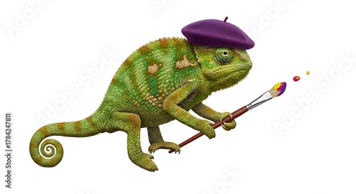 A green chameleon wearing a purple beret holding a paintbrush with paint on a white background image