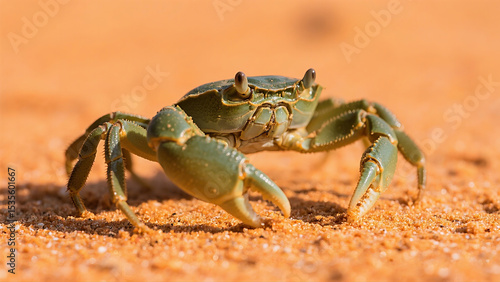 a green crab walking on orange sand. The image is well-lit with natural light and features clear details.