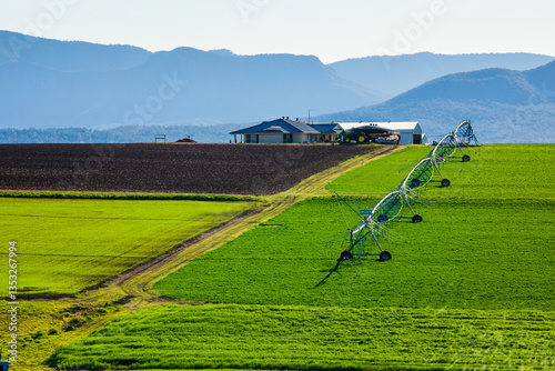 green, crop, growing, adjacent, house, hill, farm, paddock, farming, rural, agriculture, land, country, home, mountain, queensland, irrigation, growth, fertile, farmland, sprinkler