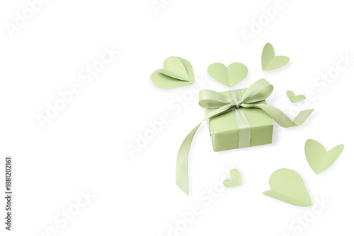 A green gift box surrounded by heart shapes for 8 March, isolated, PNG