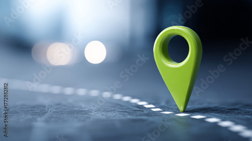 A green pin is placed on a road with white lines, indicating the destination or location of interest in navigation systems.