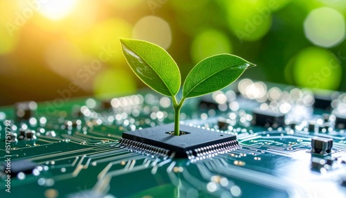 A green plant sprout grows from a microchip on a circuit board, symbolizing eco-friendly technology and sustainability.