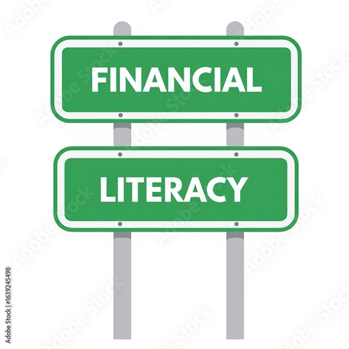 A green sign displaying "Financial Literacy" to promote understanding of personal finance and money management
