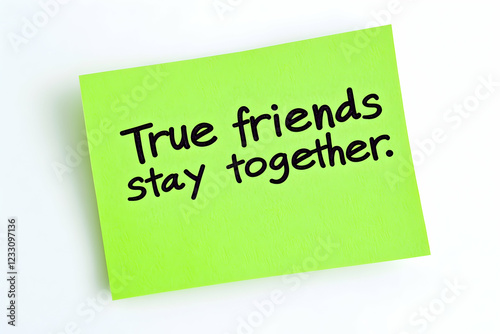 A green sticky note with the quote "True friends stay together." isolated on the white background