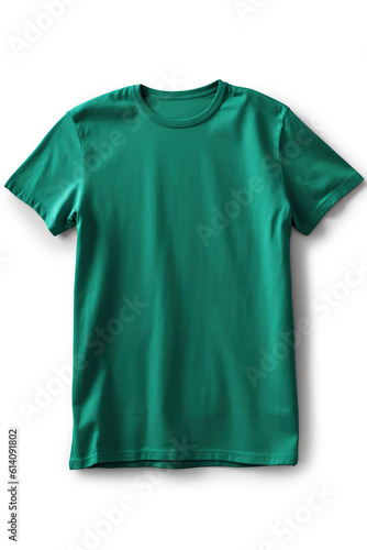 A green t-shirt on a white background. Generative AI. Tshirt mockup, copy space.