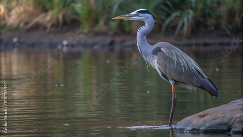 heron, grey, bird, water, shallow, duck pond, lake, stream, river, standing, wading, long, neck, leg, beak, yellow, orange, blue, green, feather, wing, blur, background, nature, wildlife, animal, wild, natural, environment, scenery, landscape