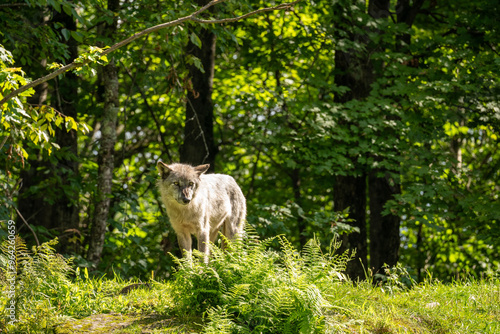 A grey wolf in a dense forest. High quality photo. Parc Omega, Ontario