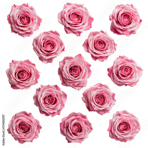 a grid of twelve delicate pink roses with tightly wound petals is displayed against a clean white background.