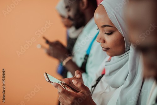 A group of African Muslim students use smartphones while standing in front of a yellow background
