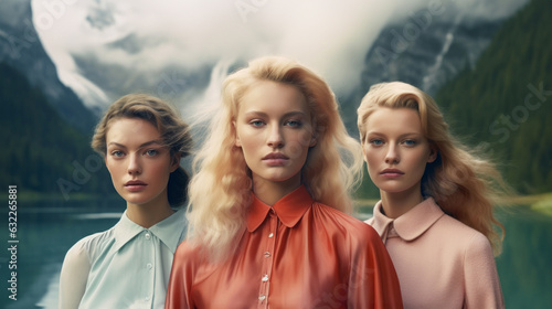 A group of beautiful women stand gracefully amidst the autumn-hued mountains of switzerland, surrounded by the foggy river and clouds, embodying both nature and fashion in a timeless portrait