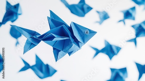 A group of blue origami fish are scattered against a white background. The fish are all facing the same direction, and the focus is on the one in the foreground.
