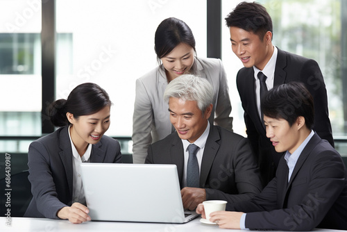 A group of business employees are looking at a data document in a laptop at an office conference and meeting room. Generative AI.