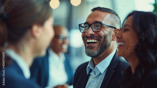 group, business, people, laughing, together, meeting, networking, professional, office, colleague, smiling, happy, socialising, teamwork, communication, conference, party, corporate, three, 2, woman, 1, man, discussion, all, dressed, attire, engaged, friendly, conversation, center, beard, goggles, widely, wearing, blue, suit, middle, side, woman, left, listening, background, blurred, like, room, sense