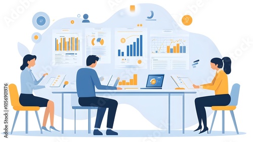 collaboration, team, presentation, analysis, growth, flat, meeting, business, strategy, chart, innovation, teamwork, technology, vector, work, illustration, people, graph, desk, success, management, computer, finance, brainstorming, design, professional, investment, background, group, office, laptop, datum, performance