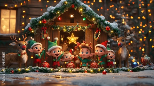 elf, christmas, reindeer, stable, light, decorating, festive, cheerful, holiday, group, scene, winter, colourful, tradition, merry, joyful, outdoors, snow, cosy, happy, celebration, garland, jolly, magic, bright, twinkle, fun, family, warmth, atmosphere, seasonal, green, red, sparkle, setting, enchanting, joy, vibrant, christmas, illuminated, craft, playful, spirit, decoration, charme