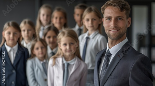 A group of children dressed in business attire standing confidently in an office setting. Their serious expressions and professional appearance emphasize ambition and leadership.