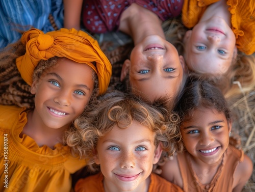 A group of children lying in a circle, smiling happily at the camera