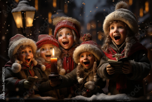 A group of children singing Old New Year's carols and going door-to-door for treats. Concept of youthful traditions and caroling. Generative Ai.