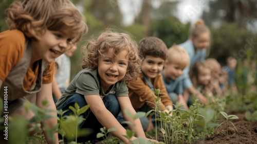 A group of children smiling and engaging in gardening, crouched down as they plant or tend to small plants in a garden setting.