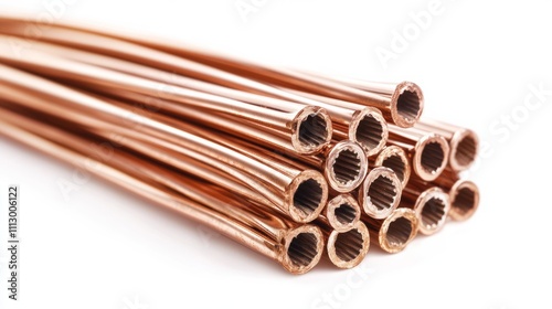 A group of copper pipes lies stacked and ready for use in various plumbing or construction projects. The clean background provides room for additional text or designs
