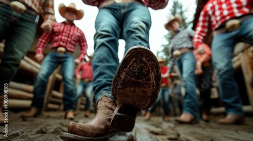 A group of cowboys gather, showcasing their rugged boots and western attire, set against a wooden floor that emphasizes their strong bond to tradition and hard work.