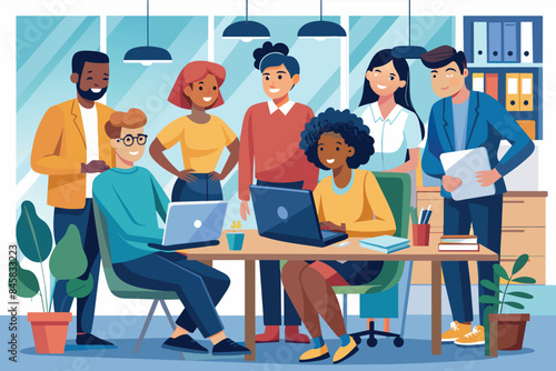 A group of diverse coworkers are working together in an office, using laptops and other technology.