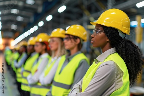 A group of diverse workers stand in line, wearing safety gear and looking forward with determination in a factory setting