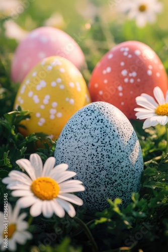 A group of eggs are scattered in a field of daisies. The eggs are of different colors and sizes, and they are surrounded by green grass. Concept of springtime and new beginnings