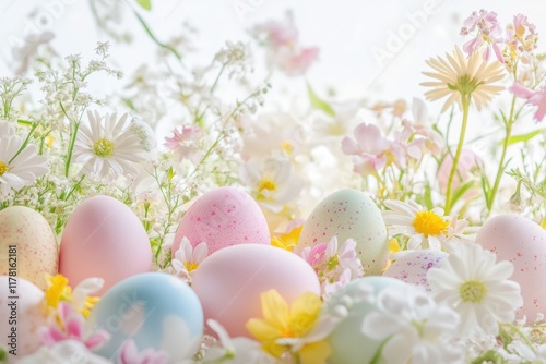 A group of eggs resting on a colorful field of flowers, suitable for use in gardening or spring-themed designs