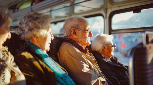 elderly, bus, sunlight, together, thought, conversation, warm, travel, group, public transport, journey, quiet, companionship, community, senior, aged, reflective, nostalgic, commute, peaceful, relaxed, social, morning, sunrise, golden hour, seating, friendship, storytelling, routine, face, seated, introspective, crowded, bonding