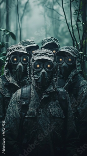 group, dressed, safari, gear, mask, costume, pose, front, haunted, jungle, glowing, eye, peeking, tree, large, copy, space, messaging, face, halloween, mask, art, horror, head, scarey, woman, carnival, evil, dark, dead, beauty, costume, black, skull, paint, monster, death, expression, person, people, skeleton, vampire