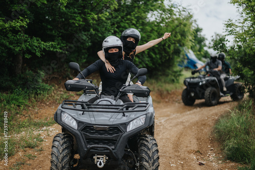 A group of friends engaging in an exciting ATV adventure along scenic forested trails. The riders express joy and celebration, showcasing the spirit of outdoor activities and the bond of friendship.