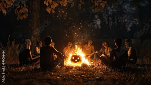 A group of friends gathered around a bonfire, telling spooky stories while dressed in Halloween costumes.