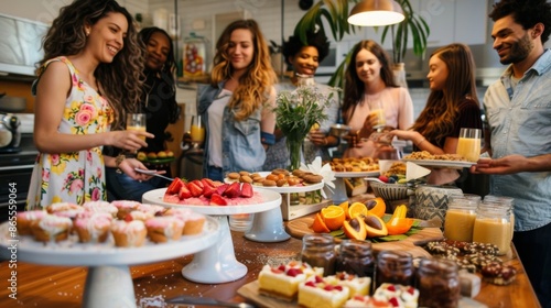 A group of friends gathered around a dessert table enjoying various vegan and glutenfree treats made with avocado oil.